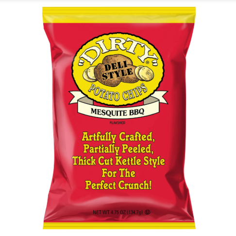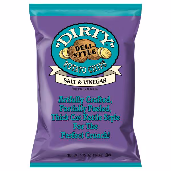 Crunch into bold flavor with Dirty Deli Style Potato Chips in Sea Salted, Mesquite BBQ, Sour Cream & Onion, and Salt & Vinegar. These kettle cooked chips deliver a hearty crunch and rich seasoning in every bite, making them a go to snack for any occasion.