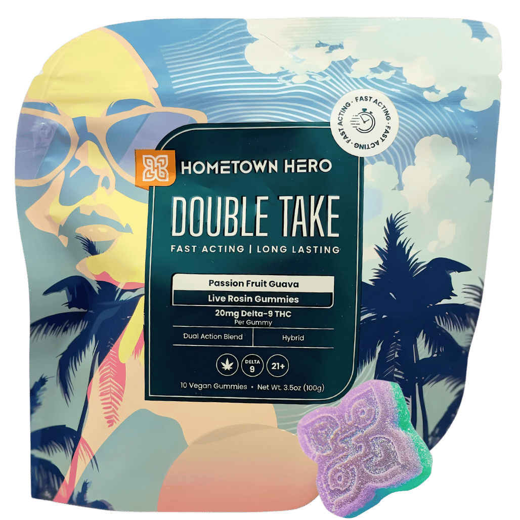 Relax and recharge with Hometown Hero Double Take Hybrid Gummies in passion fruit guava flavor. These tropical inspired gummies combine balanced hybrid effects with a sweet and tangy taste to support an uplifted yet relaxed state of mind.* The carefully crafted hybrid blend is designed to provide a smooth, enjoyable experience that fits seamlessly into your day or evening routine.